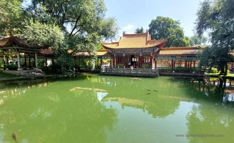 El agua desempeña un papel fundamental en el diseño del Chinagarten, actuando como elemento de conexión entre la isla, los distintos pabellones y una hermosa pagoda situada en uno de los extremos.