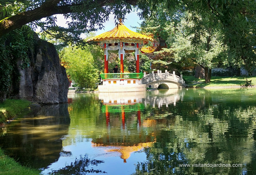 Los reflejos de los árboles y de los coloridos pabellones en las aguas calmadas del estanque contribuyen a transmitir la paz y la tranquilidad que emanan del jardín.