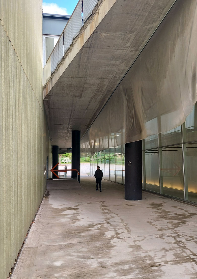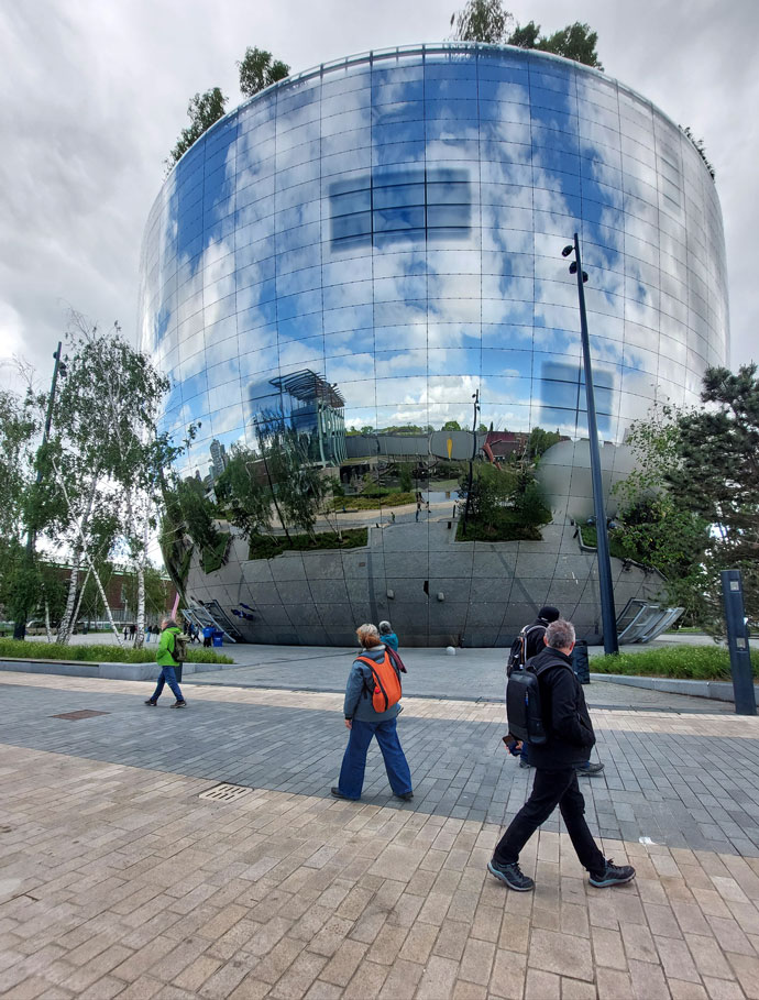 La fachada reflectante del Depósito, tiene un punto surrealista y forma un enorme espejo que incorpora el skyline de Róterdam como paisaje prestado («shakkei») al Museumpark.