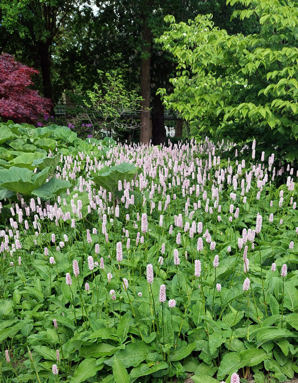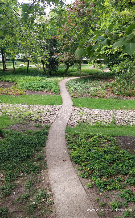 En la propuesta se conservaron los hermosos árboles existentes, entre los cuales se formó un río de guijarros blancos. A su alrededor se plantaron masas de arbustos, bulbos, plantas perennes y anuales, la mayoría con floraciones muy vistosas.