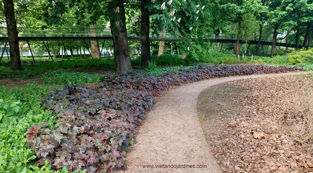 Con el fin de preservar la belleza de la vegetación emergente, se construyó un puente flotante de hormigón negro que permite a los visitantes recorrer y admirar el jardín sin pisar la vegetación que se extiende a sus pies.