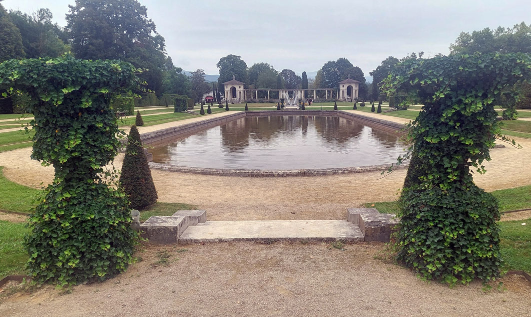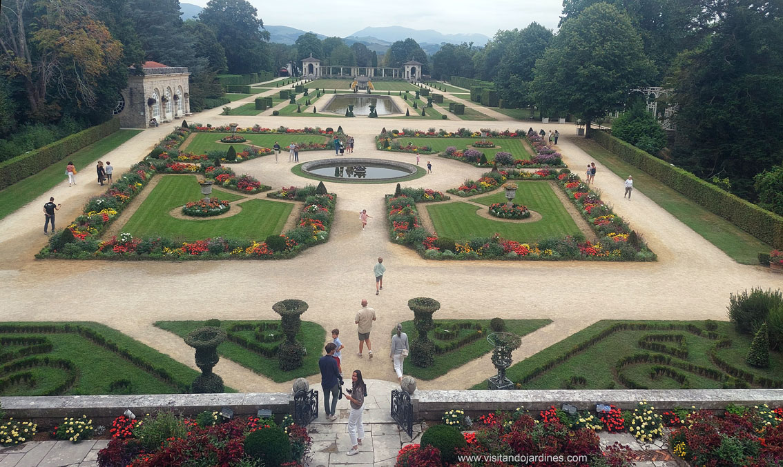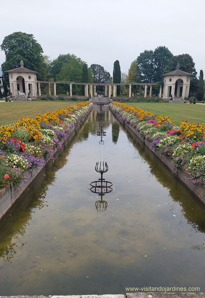 Así, frente a la villa, mandó diseñar un jardín de estilo francés, de simetrías rigurosas, parterres geométricos y espejos de agua inspirados en la solemnidad de los jardines barrocos de Le Nôtre.