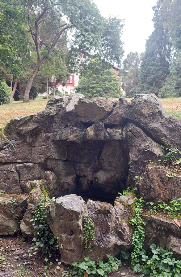 Al final del jardín, una pequeña fuente natural —que con un poco de imaginación evoca una máscara grotesca— marca el final del recorrido, que más alla abre las vistas sobre los meandros del río Nive.