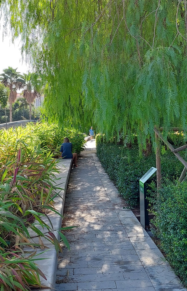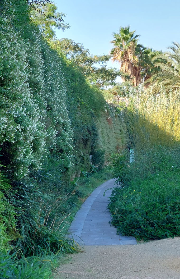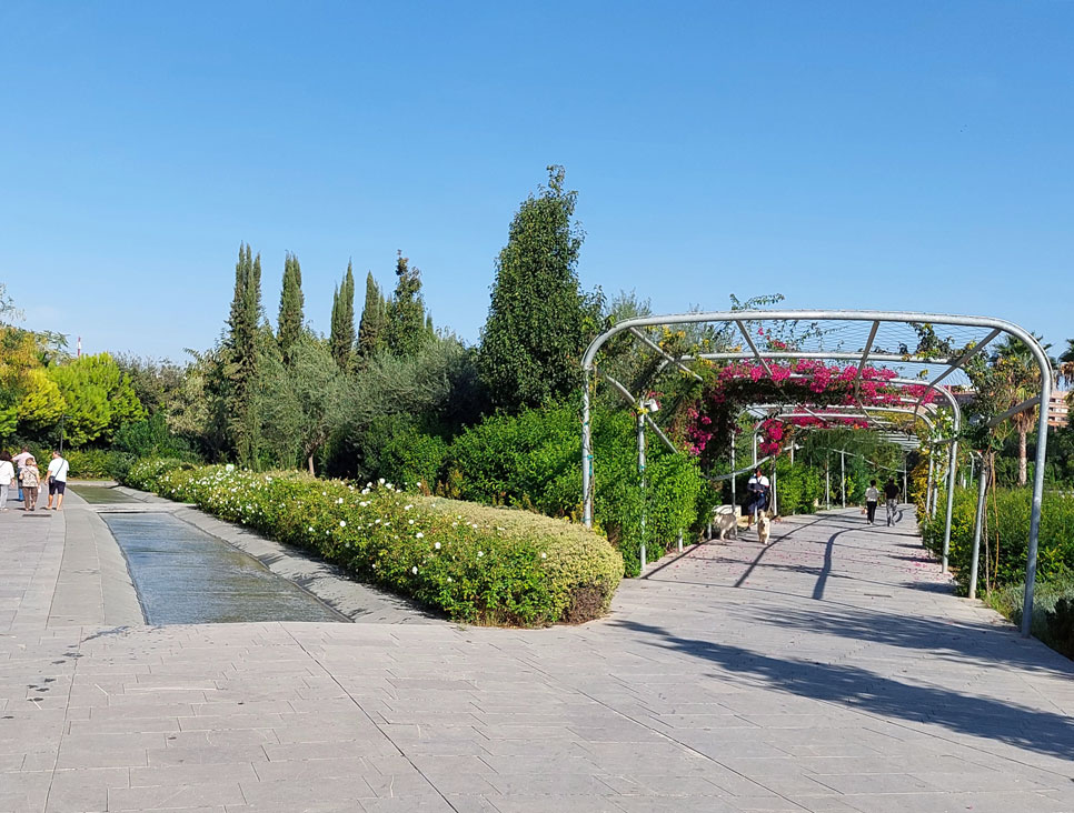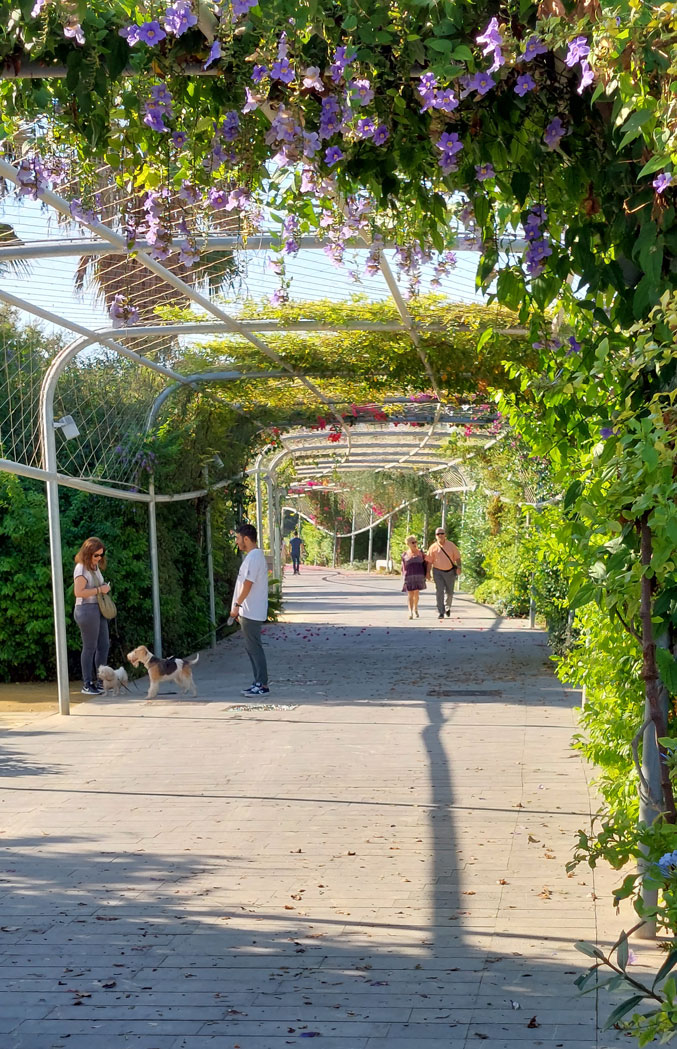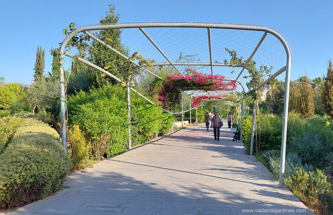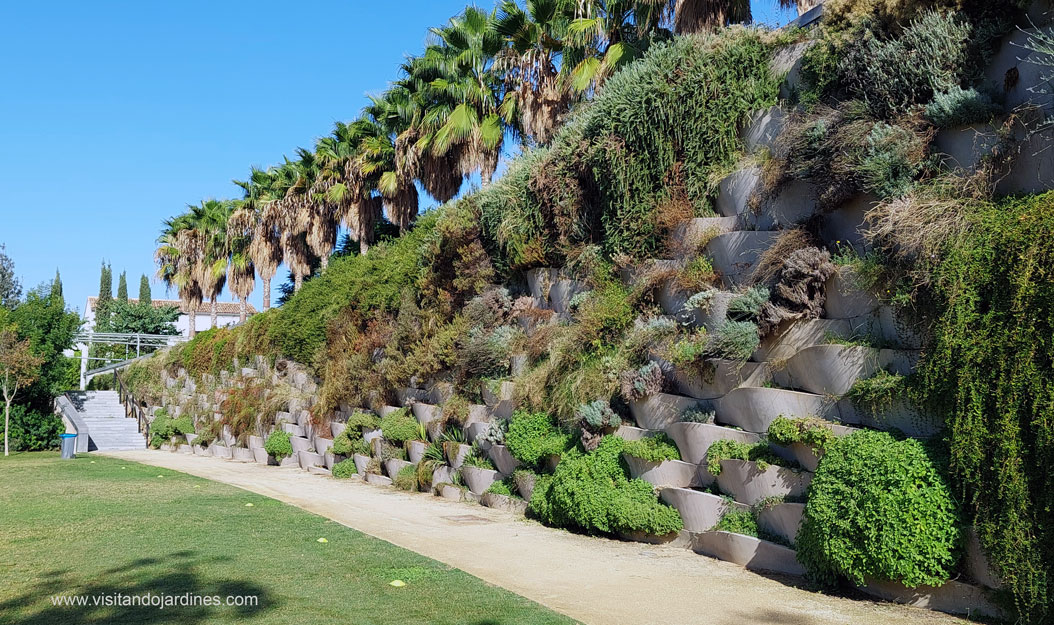 Además, cada zona tiene su propia tipología botánica y conviven praderas con palmeras, masas de vegetación espesa, muros cubiertos por arbustivas, paseos sombreados por Tipuanas y pérgolas metáliicas cubiertas por trepadoras de floración vistosa.