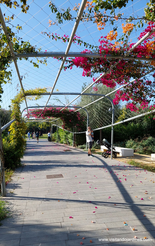 Las pérgolas marcan el camino, pero bajo sus Bouganvilleas, Mandevillas o Plumbagos que lentamente van formando una colorida cubierta vegetal, se forman zonas agradables y acojedoras donde descansar y relacionarse.