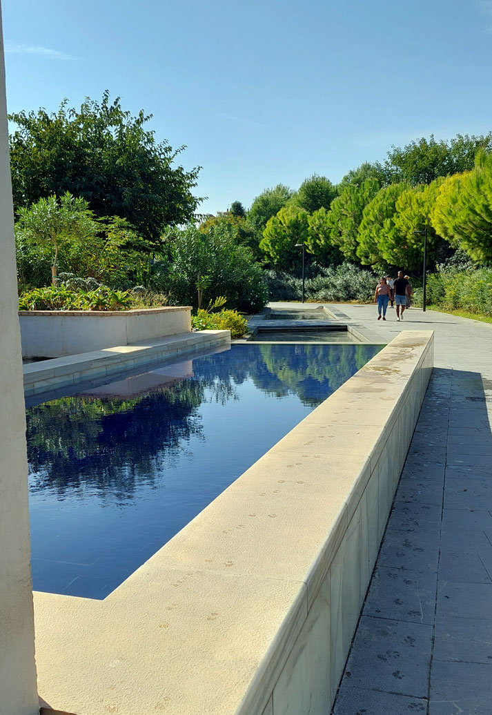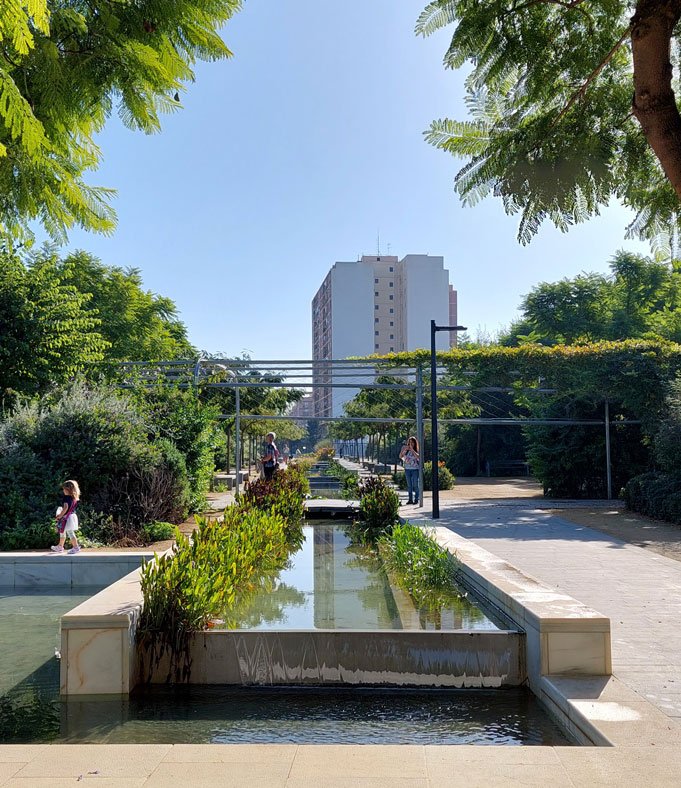 De esta forma, el agua recorre el parque como un hilo que refresca y da vida, en forma de canales estrechos, surtidores discretos o fuentes, que aportan un suspiro fresco incluso en los días más calurosos.