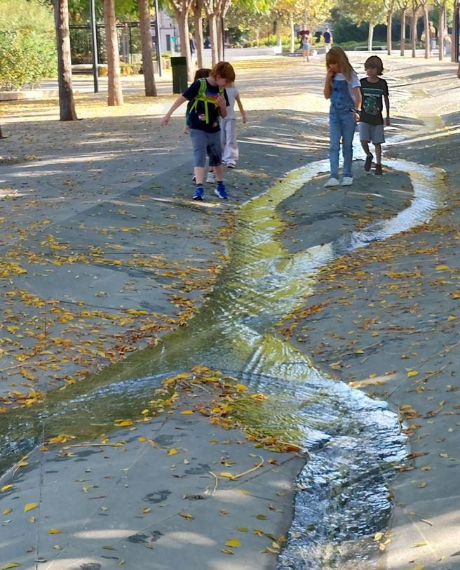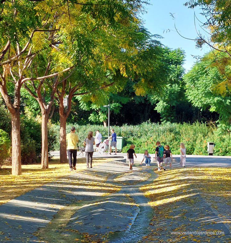 En verano, niños y adultos se acercan a jugar con las finas laminas de agua que emergen del suelo, mientras el murmullo tenue y el reflejo del sol sobre la alfombra de flores de las tipuanas crean una sensación casi mágica de paz y sosiego.