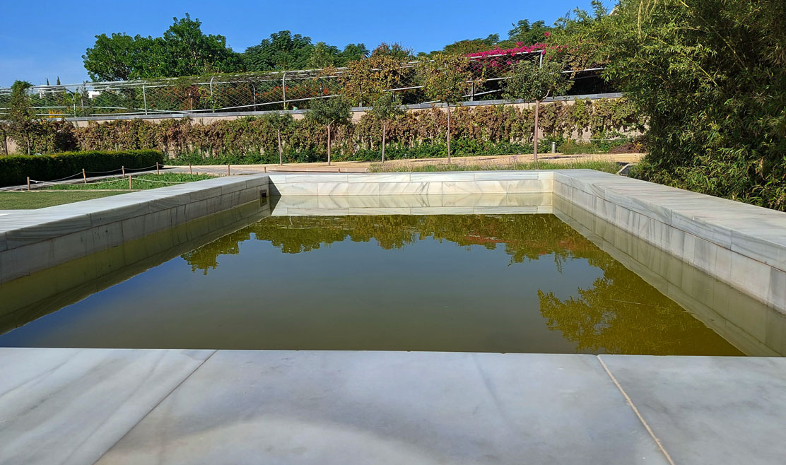 Las distintas fuentes, canales y balsas, forman un hilo conductor que va cosiendo las distintas estancias y nos invita a recorrerlas siguiendo su curso.