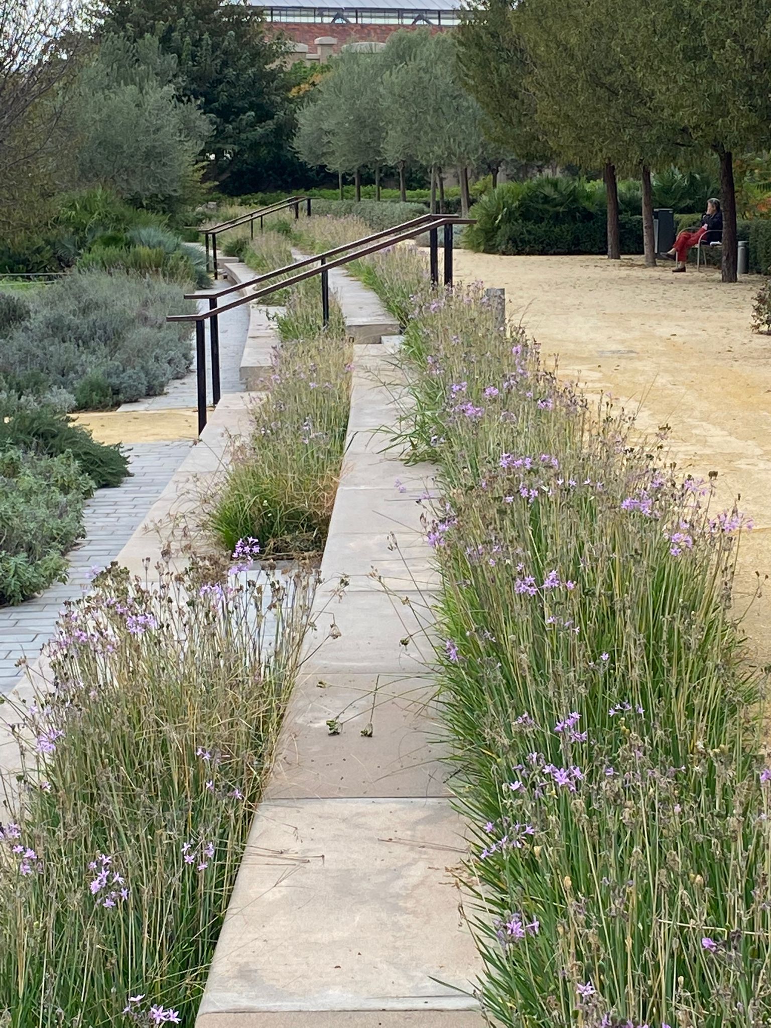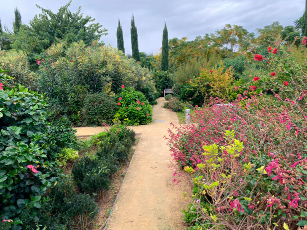 Más de mil árboles y cien mil plantas coexisten en una composición que combina especies de clima mediterráneo —pinos, jacarandas, cítricos, falsos pimenteros, palmeras— con una rica paleta floral de jazimes, romero, lavanda, rosales y thulbalgias, entre otras.