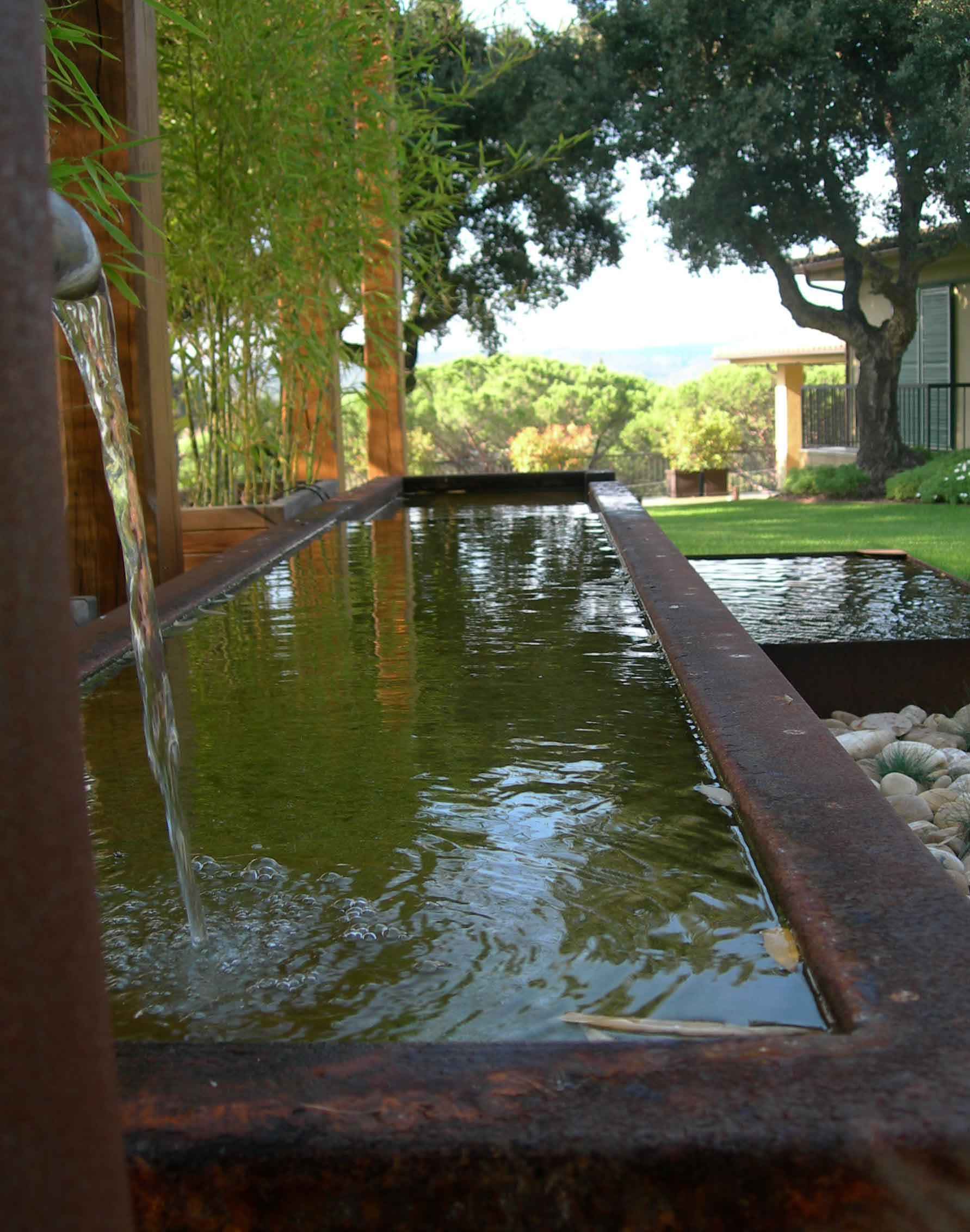 La zona de descanso, surge semiescondida por el bambú, tras una fuente singular, que conjuga agua en movimiento en chorro, un pequeño espejo y discurre lentamente a través de una pequeña casada hacia un pequeño. estanque en el nivel inferior,