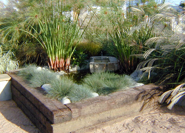 After trickling through the garden, serene and collected, the water accumulates in a small pond.