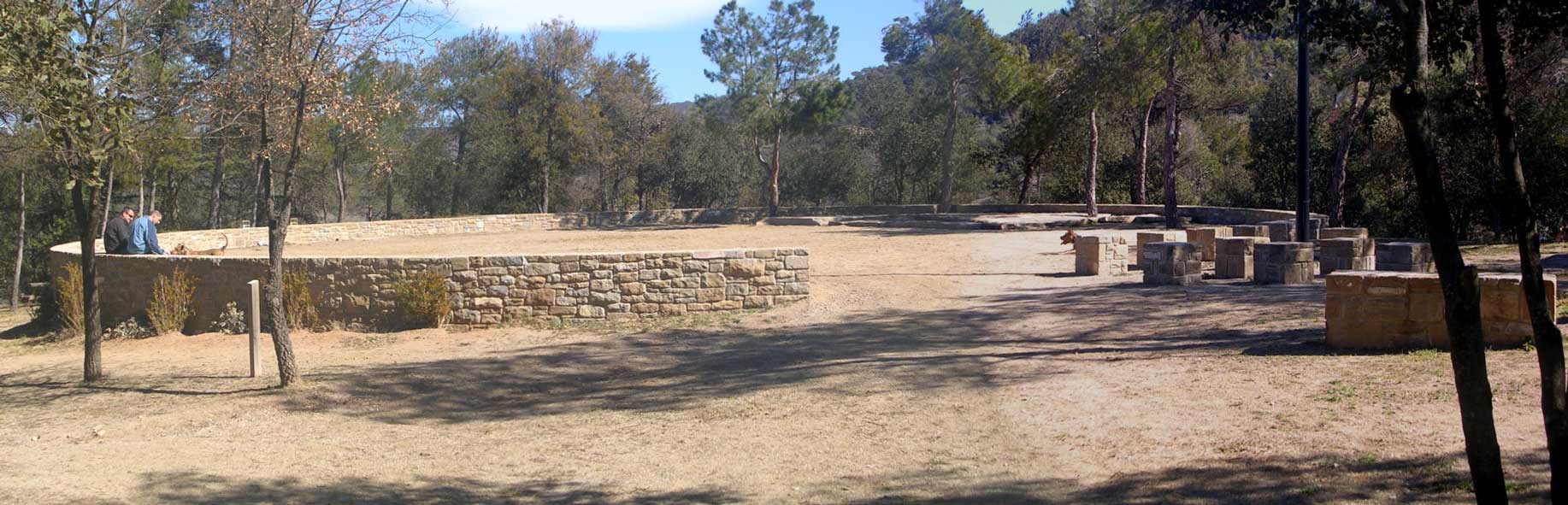 El muro de formas curvas, se descompone en piezas individuales generando un juego de volúmenes que marca el ritmo y define dos espacios diferenciados: por un lado la explanada abierta en el claro y por otro el de la fuente, de carácter más íntimo cecano al bosque.