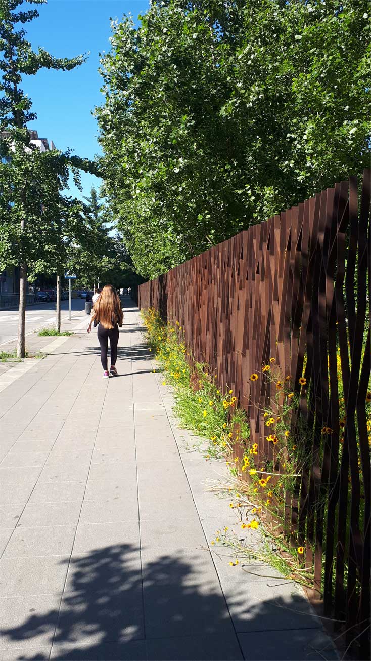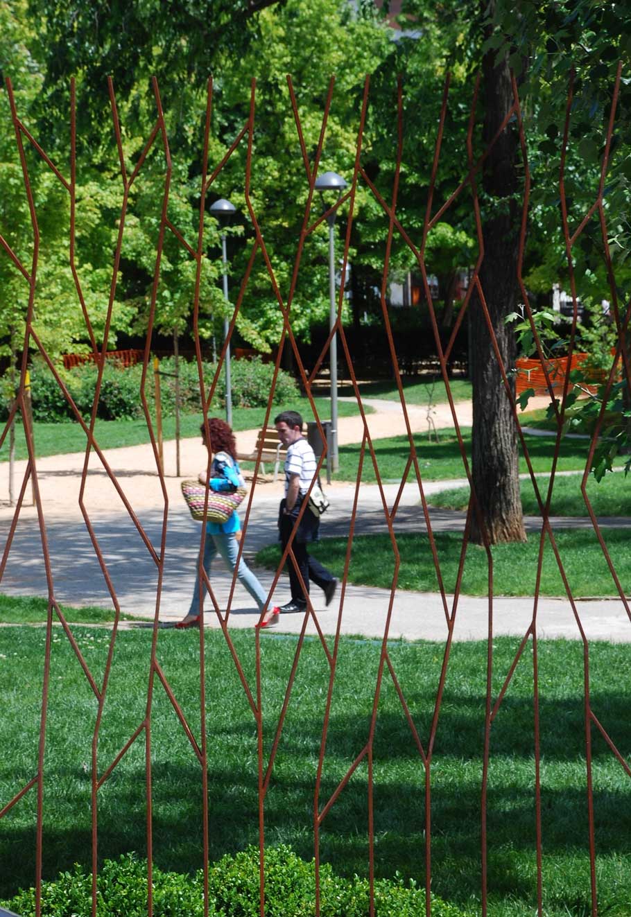 El cerramiento és potente y a la vez ligero Cuando lo miramos de frente desaparece de nuestra vista y permite intergrar el parque con el entorno urbano.
