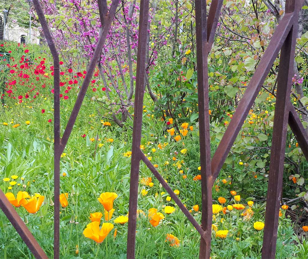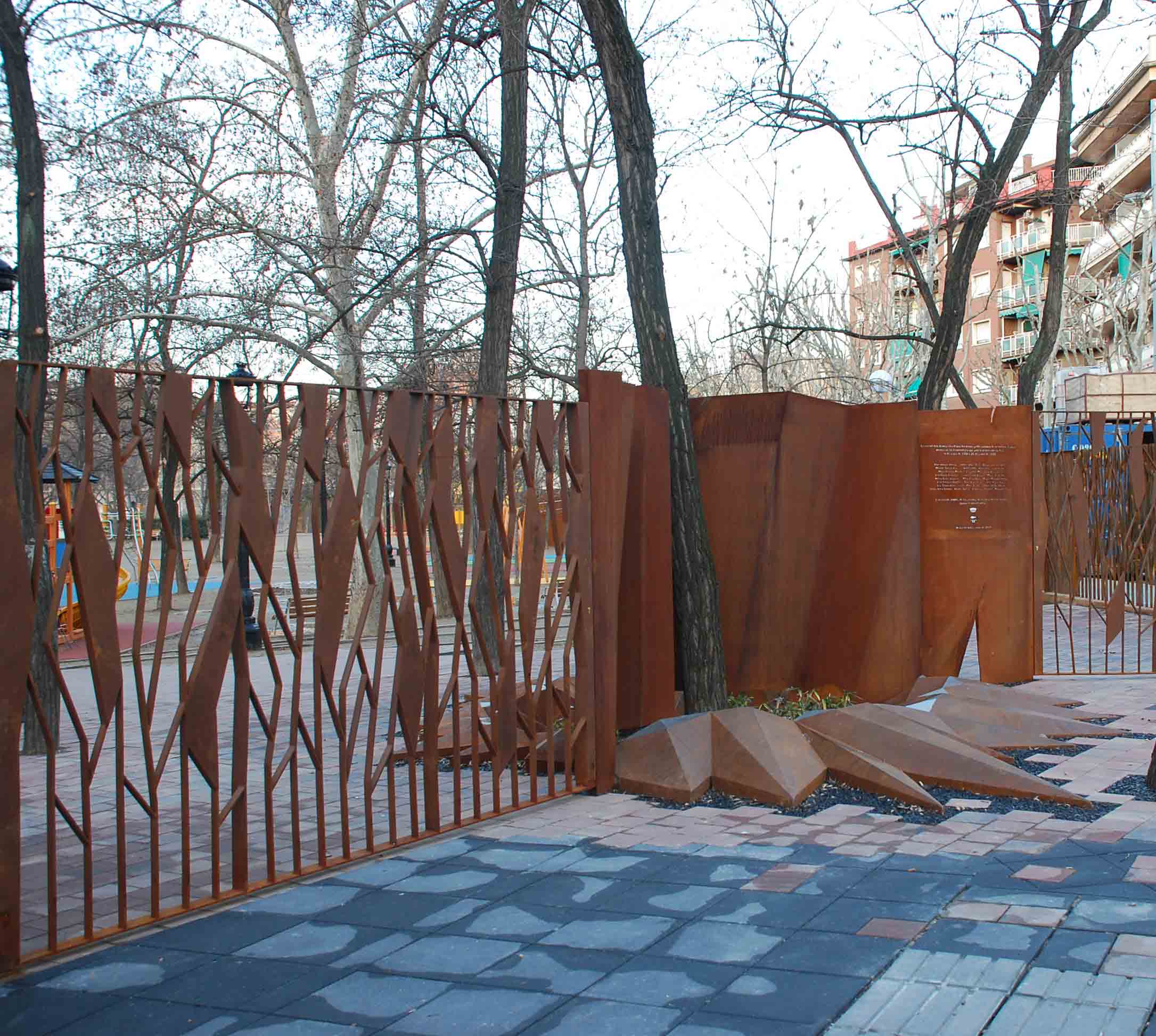 El material elegido -acero corten- es un acero patinable cuyos tonos de oxidación lo integran al cromatismo del parque en todas las estaciones.