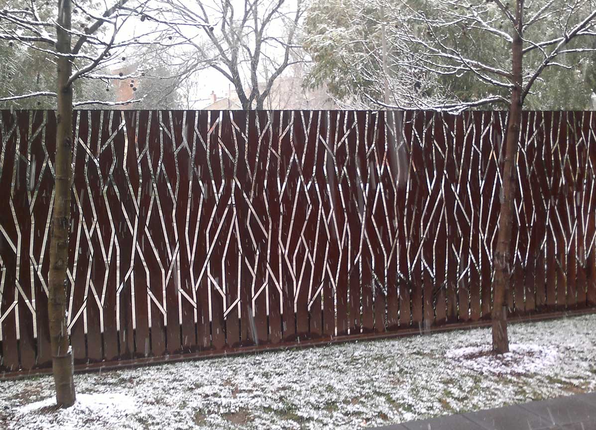A partir de la idea de que la valla no supusiera un límite visual, se desarrolló un proyecto en el que se proponía trabajar con acero cortén, creando un cerramiento de gran elegancia con dos variantes: el positivo y el negativo.