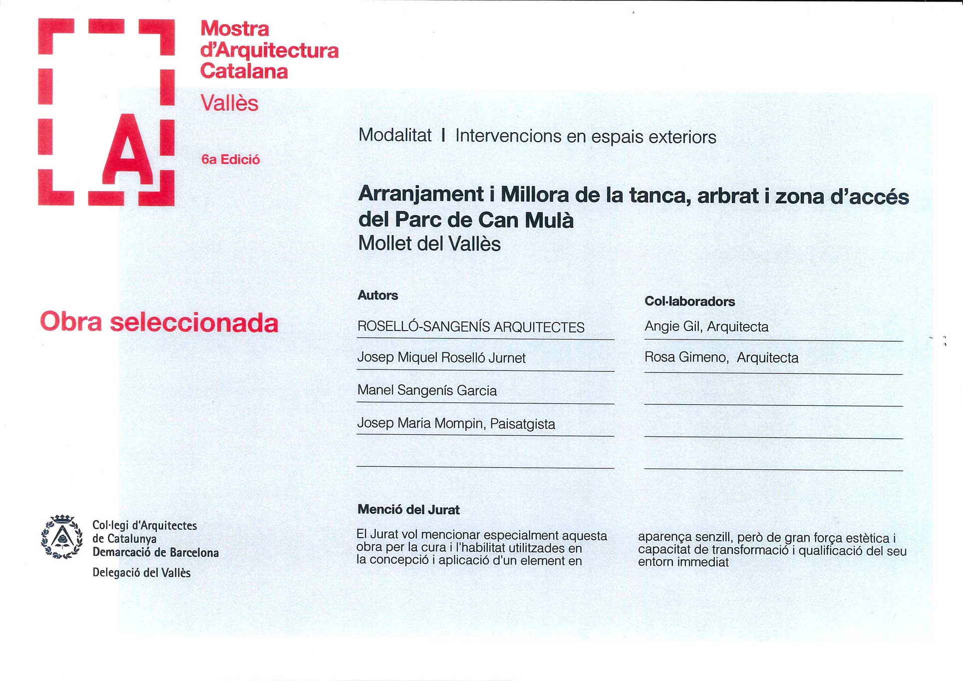 La valla de Can Mulà fue seleccionada con una mención especial en la VI muestra de Arquitectura Catalana, en el que el jurado destacó la sensibilidad, la fuerza y la capacidad de transformación positiva del espacio, que aporta la solución propuesta.